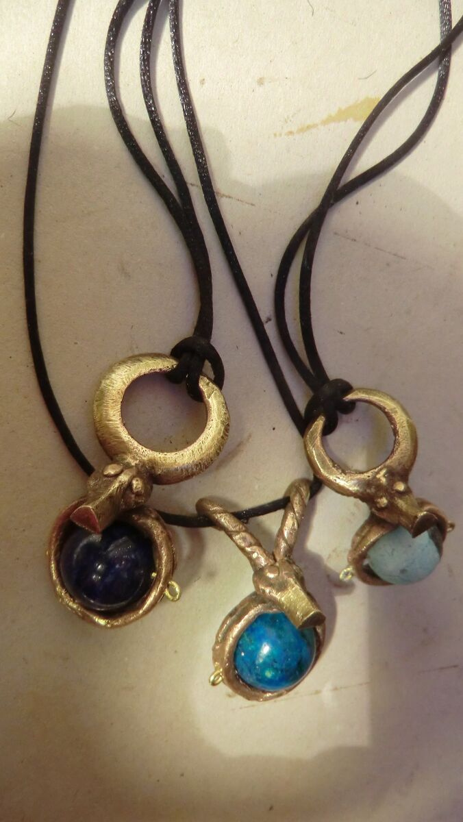 Deshalb verändere ich diese schöne Kleinplastiken durch eine meist blaue oder blaugrüne Edelsteinkugel (Lapislazuli, Sodalit, Tansanit, Chrisokolla, Türkis) zu einem Anhänger. Warmes Goldgelb des Metalls und kühles Blau steigern sich zu harmonierendem Leben.